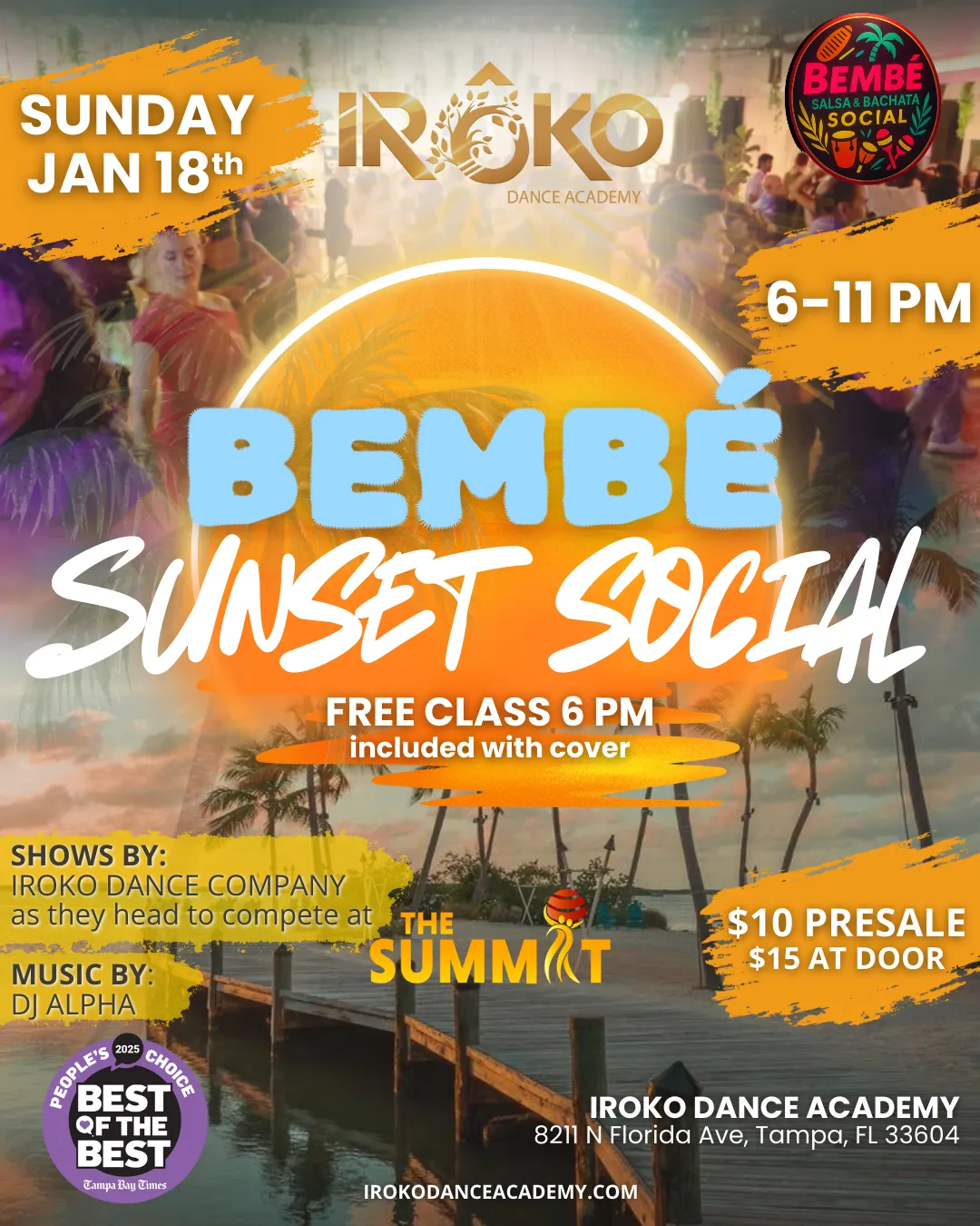 Bembé Sunset Social - Music by DJ Alpha, keeping the vibes high from start to finish. This special night is all about supporting our Iroko teams as they prepare to represent Tampa, Florida at one of the most important competitions in the world, The Summit!