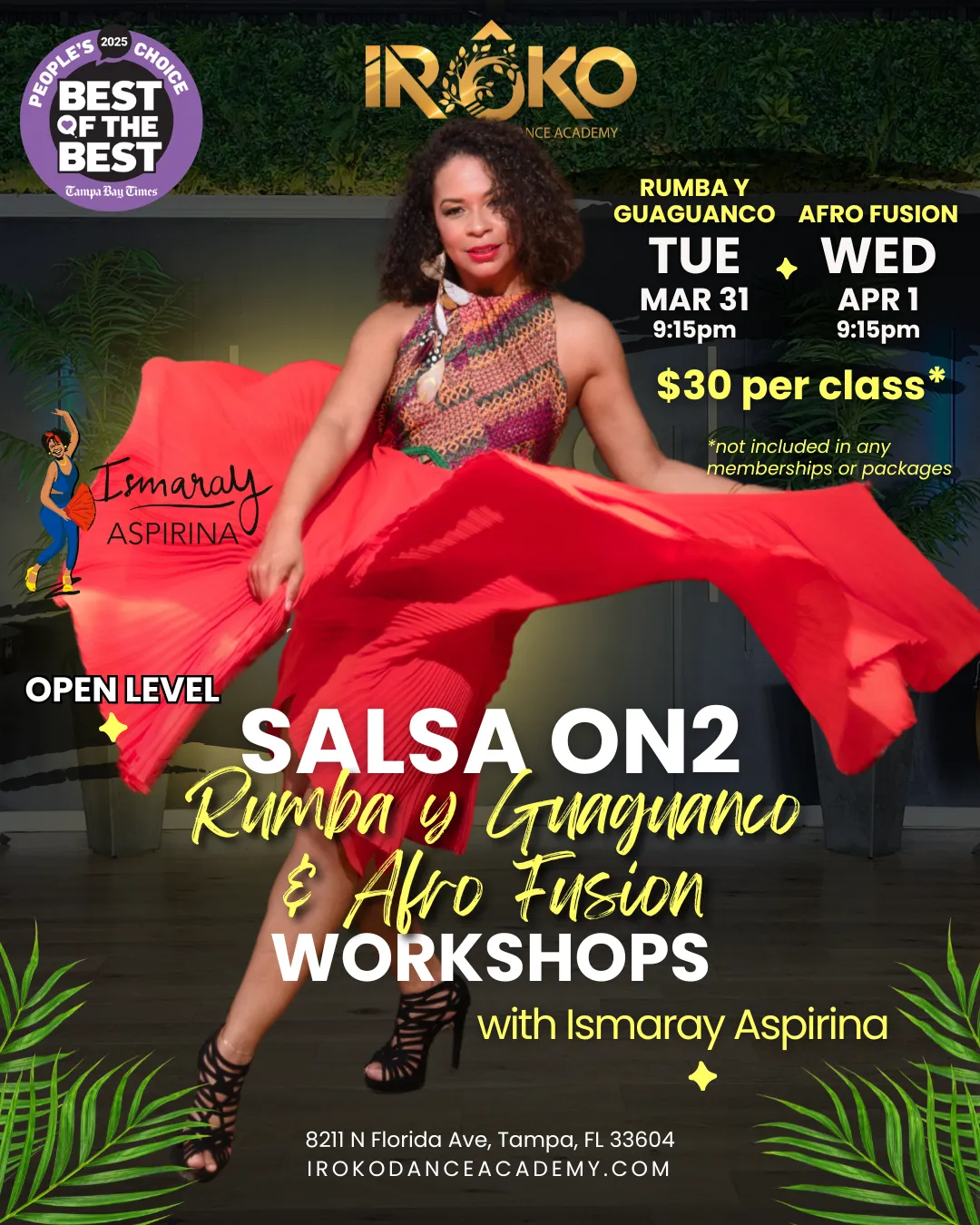 Experience the roots of Afro‑Cuban movement with Rumba y Guaguancó and Afro Fusion workshops led by Ismaray Aspirina
