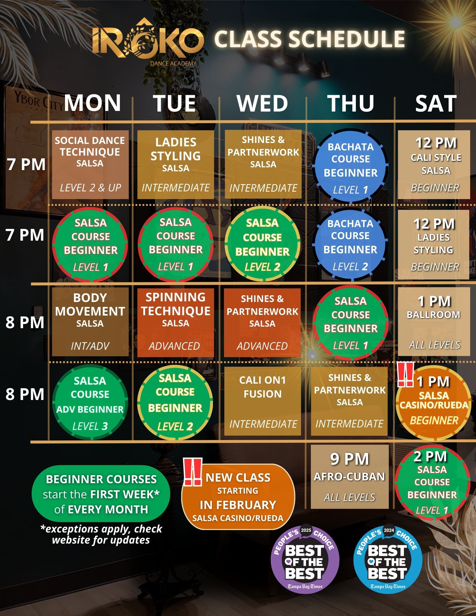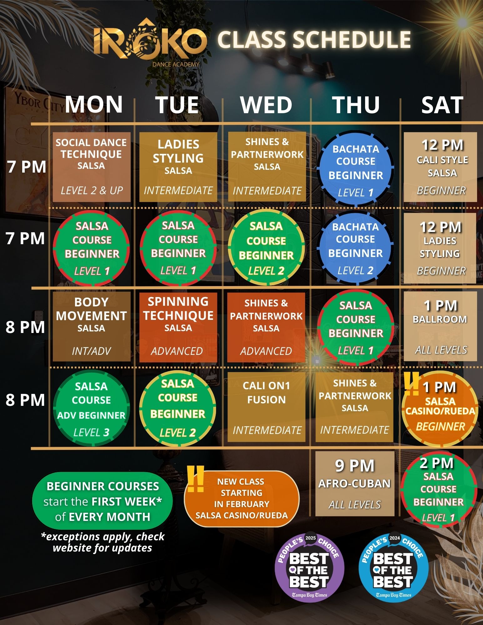 Salsa Beginner Courses consist of THREE levels to better prepare you to take intermediate classes. You will test out of each level after a minimum of 2-3 months* in each.